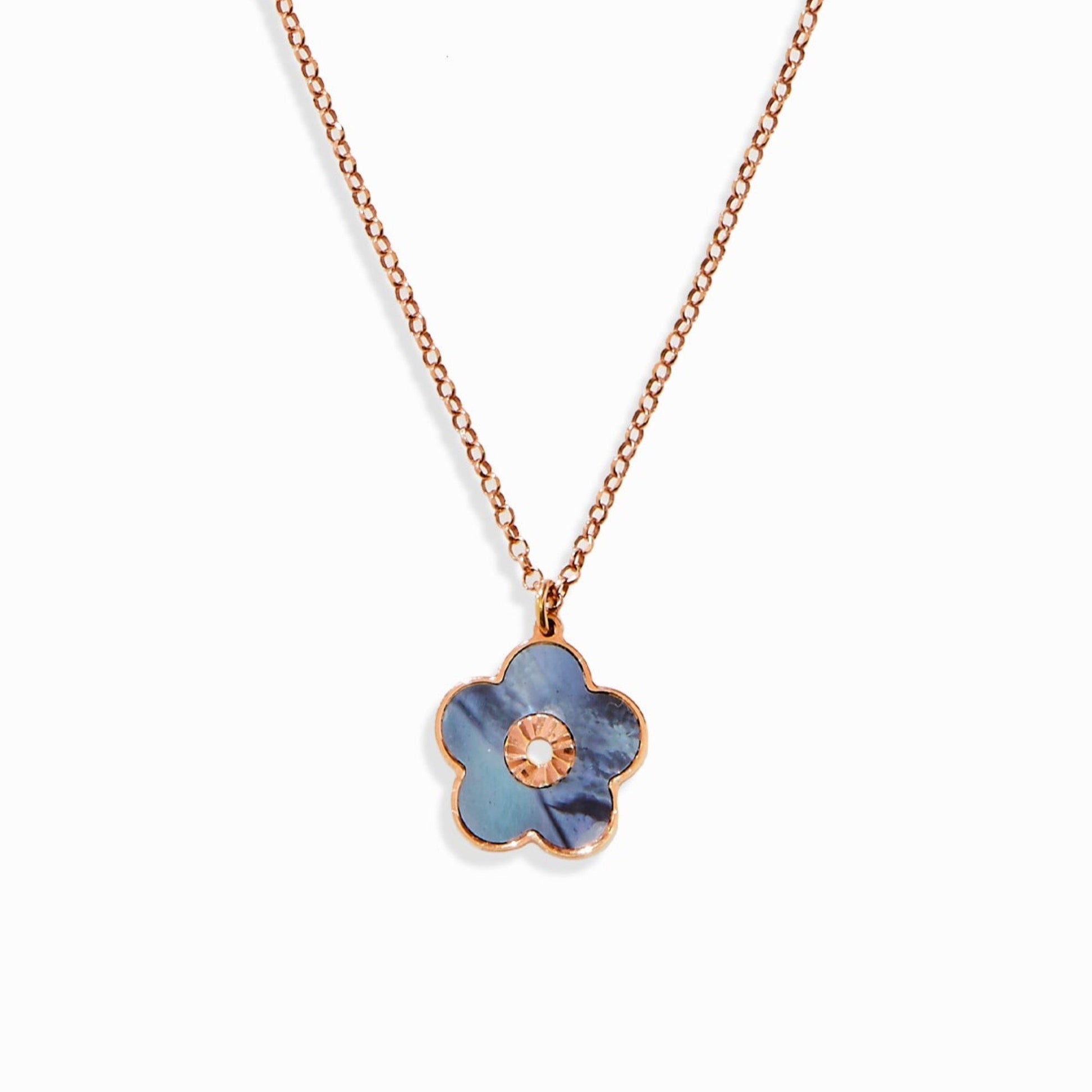 A delicate charm necklace with a flower pendant made of Mother of Pearl. Double sided in white and blue this necklace is ideal to wear alone or for layering.