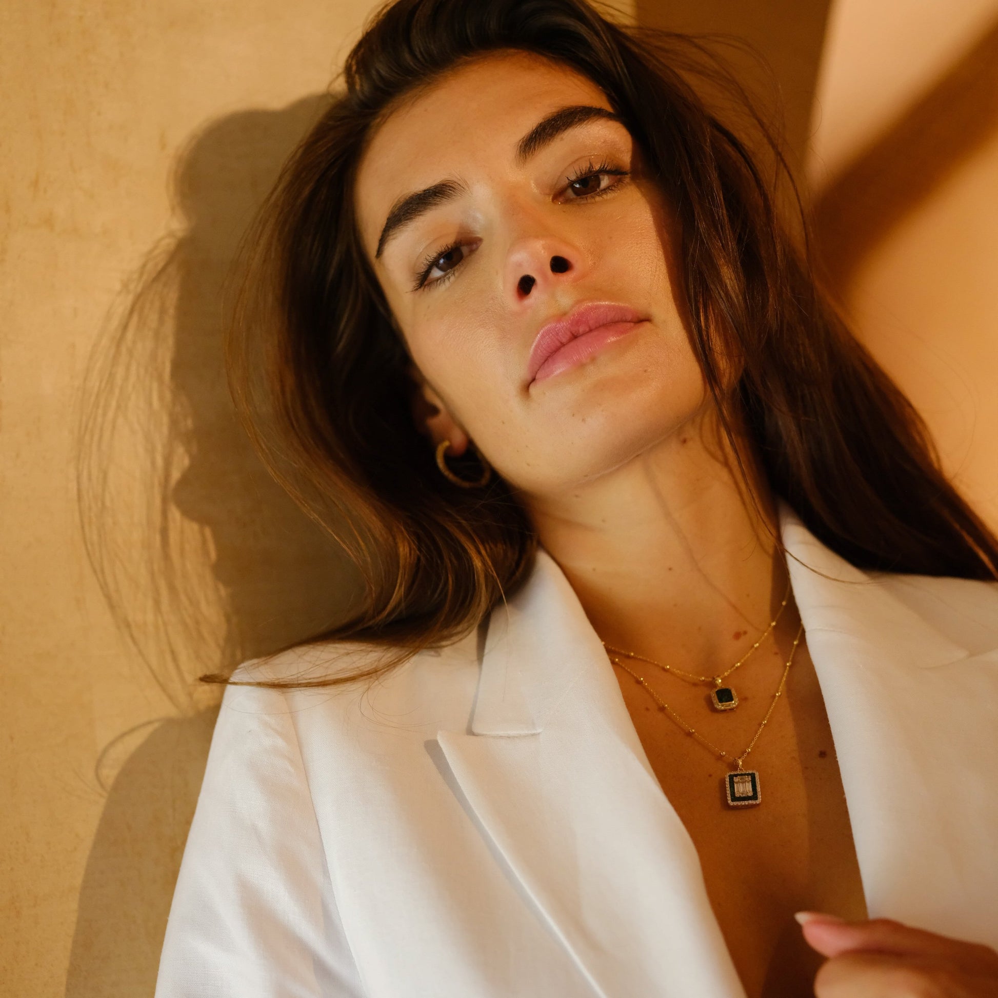 Elevate your style with this exquisite 925 sterling silver necklace, plated in 18K gold. It features a decorative pendant adorned with deep green and white zirconia stones, offering a perfect blend of elegance and versatility for any occasion.